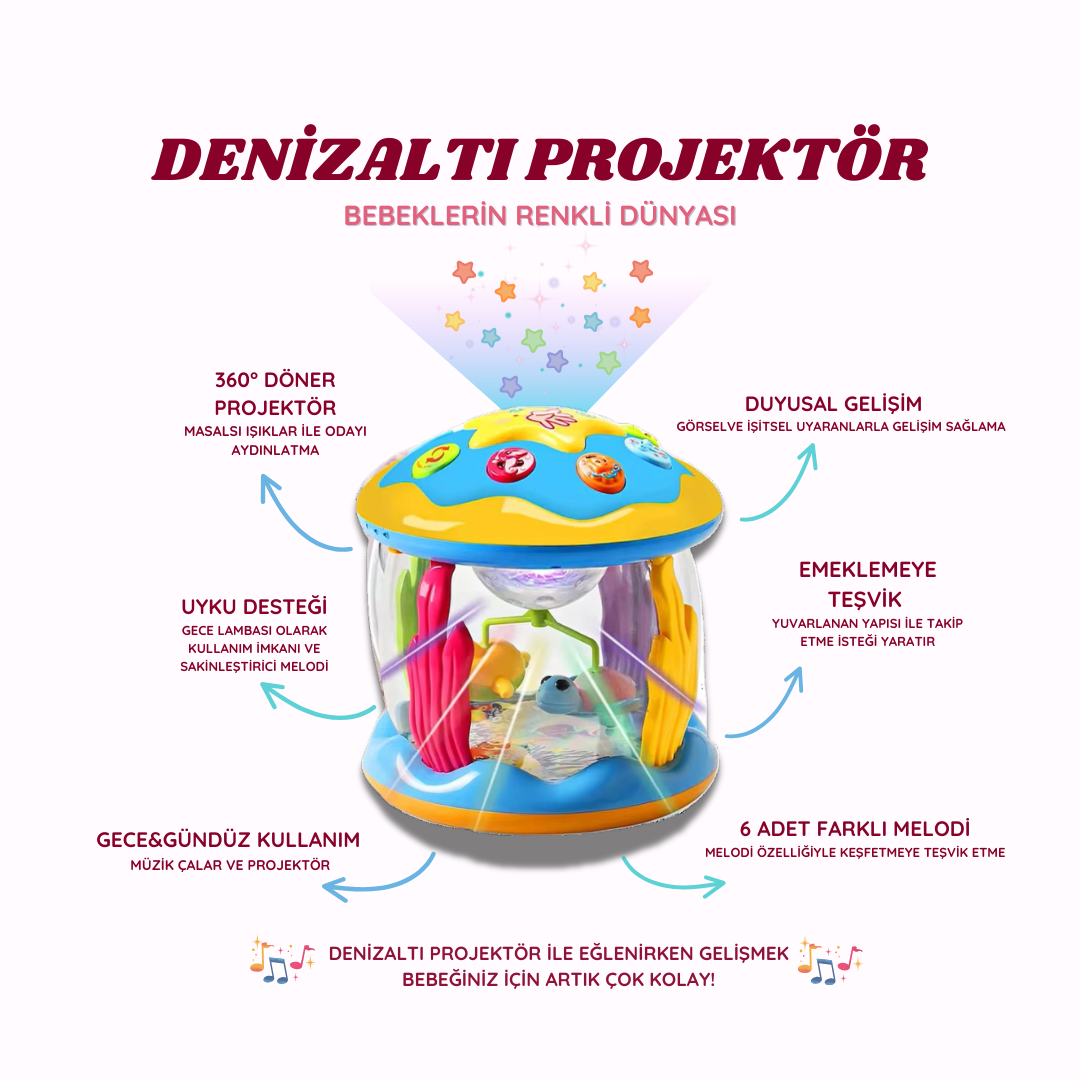 Işıklar, müzikler ve hareket bir arada! Bu döner projektörlü oyuncak, masalsı ışıkları ve neşeli melodileriyle bebeğinizin duyularını harekete geçirir.