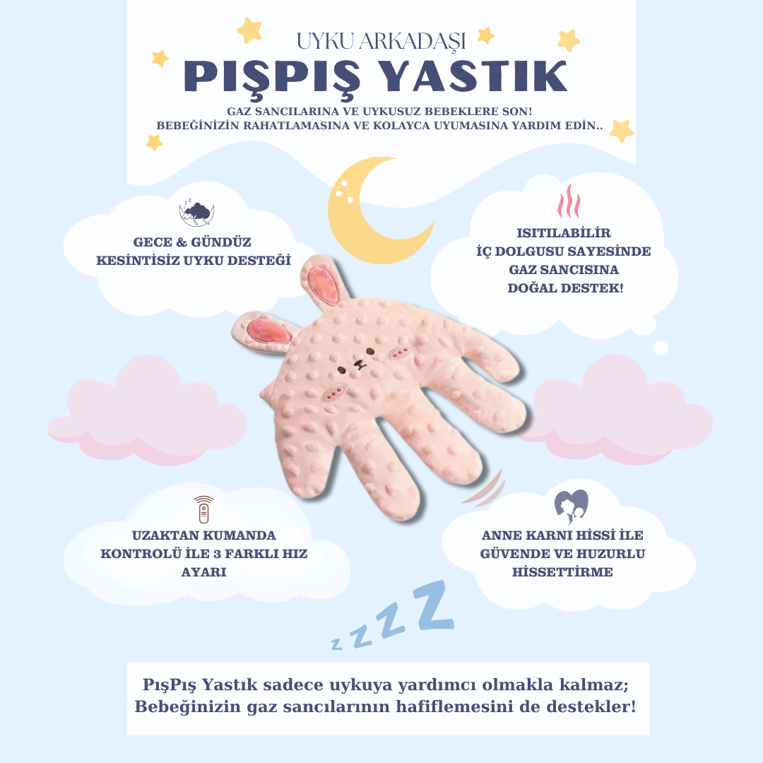Gaz sancısı mı, uykusuz geceler mi? PışPış Yastık tek dokunuşla her ikisine de çözüm sunar! Annelerin pışpış hızına uyumlu hareketiyle bebeğinizi sakinleştirir, ısıtılabilir fasulye dolgulu parmaklarıyla gaz sancılarına doğal rahatlama sağlar.